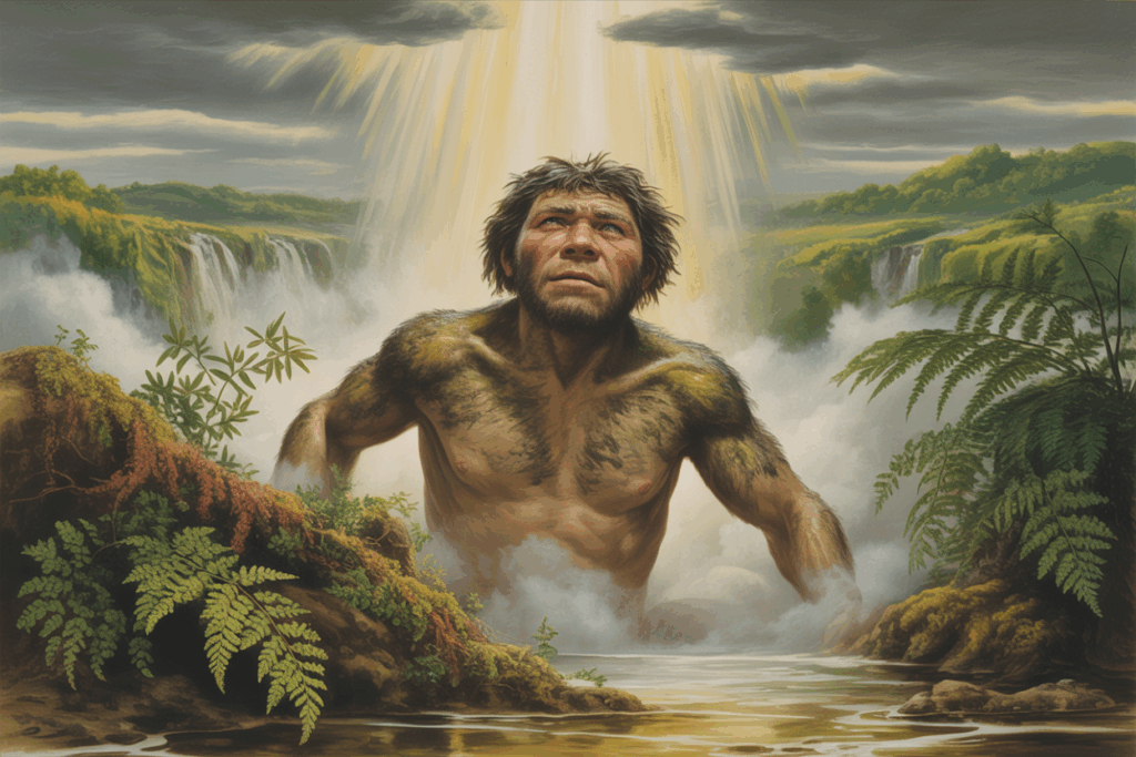 Staub lag auf den Blättern, Schweiß rann über die Rücken, Matsch und Modder klebten an jeder Bewegung. Der Mensch – noch nah am Tier – lebte gebückt, trank aus Tümpeln, wusch sich nicht, denn er kannte es nicht. Die Luft war dumpf, der Blick getrübt, der Atem schwer. So war der Urzustand: dumpf, träge, unrein.