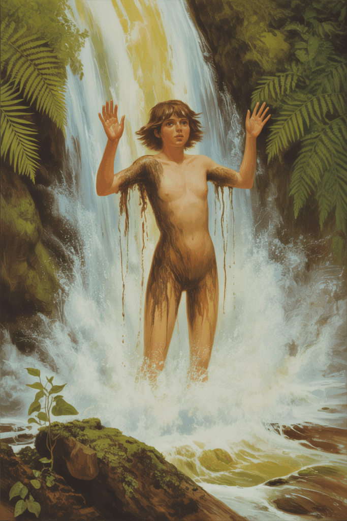 Das Wesen sah Nebel über Farnen, hörte ein fernes Donnern, das keine Stimme der Erde war. Es zog dahin, wo die Luft feucht und schwer war, wo Tropfen an Blättern hingen, als wüssten sie um ein Geheimnis. Es stieg auf zu den Felsen, drang durch Schluchten, durchschritt Schatten, in denen nur das Rauschen lebte.